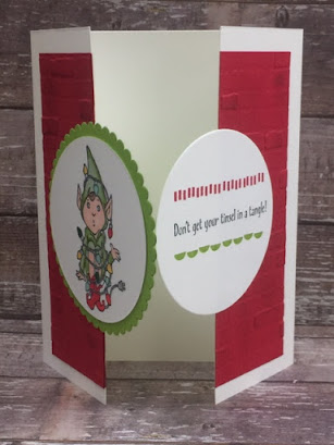 Stamp Images, Color to your liking and then Adhere the elf to the scallop and then both circles (hiding the greeting in back of the green scallop) Adhere to opposite folds on the card. Give to your friend and listen to them ooh and ahh!